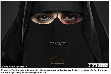 A propaganda saudita mostra o rosto de uma mulher que acaba de apanhar, com uma marca vermelha em um dos olhos. O ferimento ficam em destaque porque a mulher usa um niqab, vestimenta típica das muçulmanas que deixa apenas os olhos à mostra.